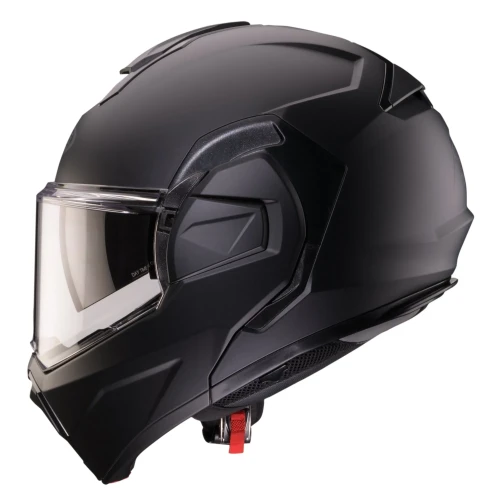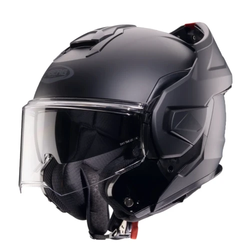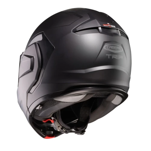 Caberg Trip Sort Matt er Cabergs første flip-back motorsykkelhjelm, med en unik og reverserbar hakebøyle som roteres hele 180 grader bak på hjelmen. I motsetning til tradisjonelle åpningshjelmer blir ikke hakepartiet liggende på toppen, noe som gir bedre balanse, komfort og aerodynamikk når hjelmen brukes åpen.