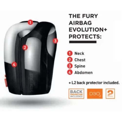 Furygan Airbag Evolution+ vest er utviklet av In&motion. De består av verdens største team av utviklere av airbag til motorsyklister. Dette er i skrivede stund, verdens letteste elektroniske airbag!!Furygan Airbag Evolution+ vest som vi presenterer her trenger en elektronisk boks (In&box) for å fungere som airbag. Denne boksen med elektronikk kjøpes eller leases fra www.inemotion.com etter at vesten er kjøpt (mer info nederst i artikkelen).