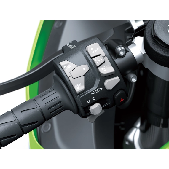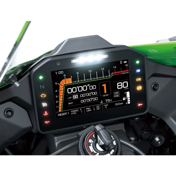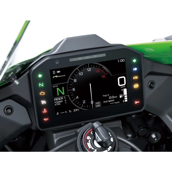 Teknologien om bord er avansert og skreddersydd for ytelse og kontroll. Det intuitive TFT-displayet gir oversiktlig informasjon om hastighet, turtall, kjøremodus, girposisjon og systemstatus. Kawasaki har utstyrt ZX-10R med en rekke elektroniske hjelpemidler som cornering ABS, traction control, wheelie control, launch control og quickshifter for både opp- og nedgir. Disse systemene jobber sømløst for å gi deg maksimal kontroll, både i gatekjøring og på bane.