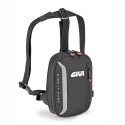Vesken bæres med én justerbar stropp rundt livet og én rundt låret, begge designet for å tilpasse seg kroppen komfortabelt og sikre stabilitet under bevegelse.