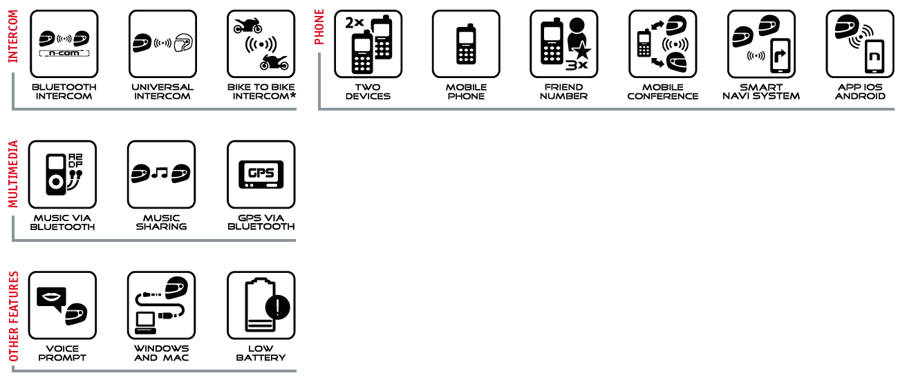 - Bike-To-Bike intercom kommunikasjon inntil 250 meter i åpente lende uten hindring. En-til-en kommunikasjon. Bike-to-bike Call funksjon