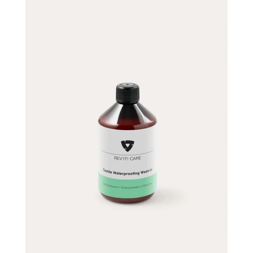 REV’IT! Maintenance Textile Waterproofing Wash-in er en biobasert, fluorokarbonfri vask-inn impregnering som gjenoppretter vannavvisningen (DWR) i vanntette tekstilplagg. Trygg å bruke på GORE-TEX og andre membraner, egnet for polyester, polyamid, ull og dun, og bidrar til å bevare pusteevne, farge og stoffkvalitet. 500 ml flaske.