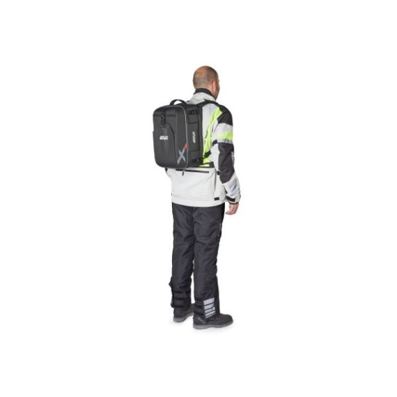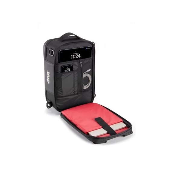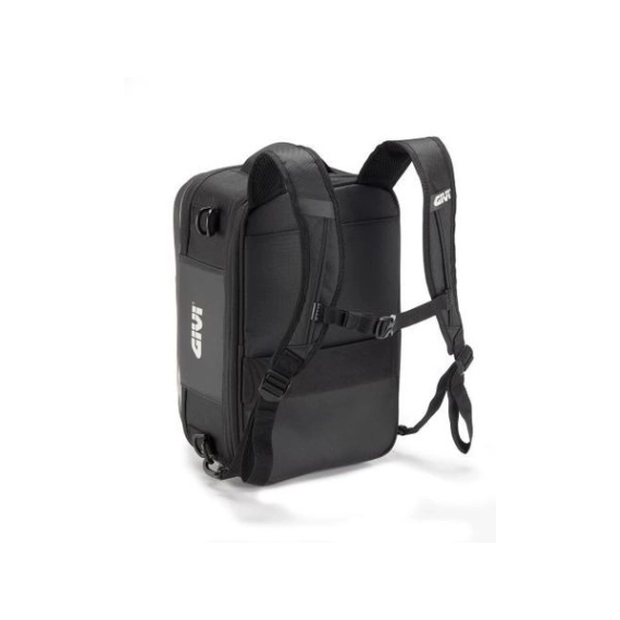 En praktisk stropp på bakpanelet gjør at ryggsekken enkelt kan festes til en trillekoffert, noe som gjør den praktisk for bruk på flyreiser. Takket være de avtakbare skulderstroppene, kan ryggsekken også festes til salen på motorsykkelen, eller som ekstra last på toppbokser, ved hjelp av de medfølgende stroppene.