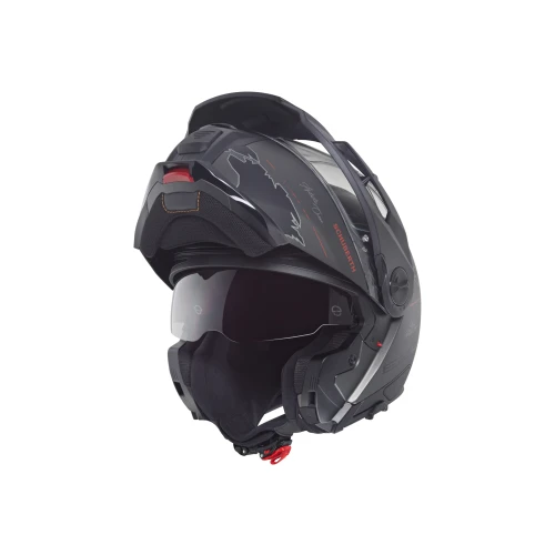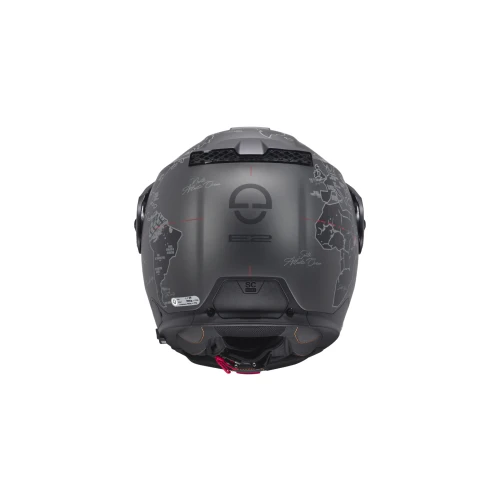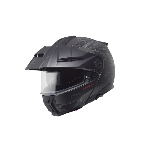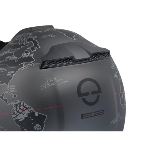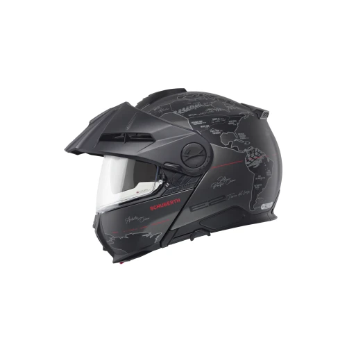 Motorsykkel hjelmen, E2, er andre generasjon av SCHUBERTHs adventure-hjelmer og den andre hjelmen i deres sortiment med P/J dobbel homologering i samsvar med den nye ECE 22.06-standarden. E2 kombinerer komforten fra den populære Flip Up/åpnings hjelmen i "C"-serien med det tøffe utseendet og funksjonaliteten til en offroad-hjelm. Med tilpasningsdyktig interiørpolstring som gir perfekt passform, er denne hjelmen designet for å takle selv de mest krevende og støvete stiene.