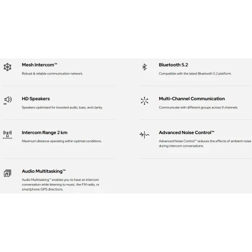- Mesh Intercom™: Opptil 2 km i åpent terreng (kan utvides til 8 km med min. 6 ryttere).