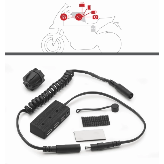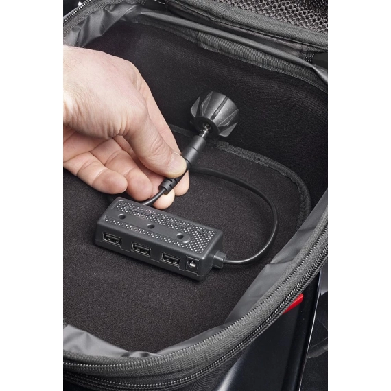 12V USB Strømforsyning for tankvesker. 3stk USB utganger og en fjerde 12V ISO kontakt.