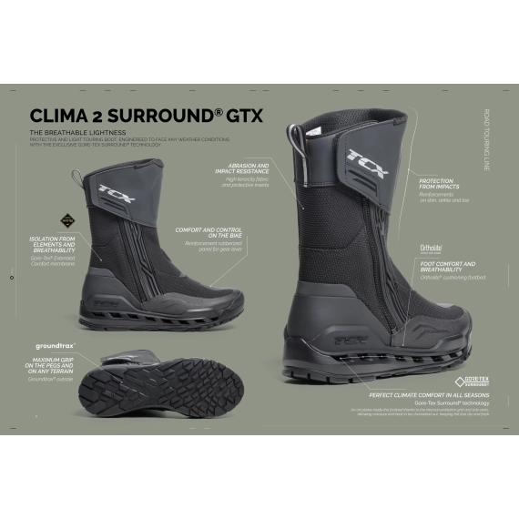 Oppdag de ultimate touring støvlene som kombinerer beskyttelse, vanntetthet og komfort for alle værforhold. Clima 2 Gore-Tex Surround® støvler tilbyr den perfekte balansen mellom stoff og forsterkede områder, noe som gjør dem både lette og komfortable, samtidig som de garanterer maksimal sikkerhet på de mest utsatte områdene for støt og slitasje.TCX CLIMA 2 GORE-TEX Surround MC Støvler er nyutviklet med siste tekniske oppdateringer fra GORE-TEX. GORE-TEX Surround teknologi sikrer maksimal komfort og tørre føtter via 360 grader klimakomfort. GORE-TEX Extended Comfort Footwear teknologi tilbyr en optimal ventilasjon via mange kanaler i støvelen, slik at membran og føttene får maksimalt med luft inn/ut uten at det går på kompromiss med vanntetthet. Den unike sålekonstruksjonen med luftekanaler langs hele siden, tillater fuktighet og varme å forlate foten/støvelen både over og under støvelen via den laminerte GORE-TEX membranen.