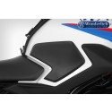 These tank pads are coordinated to the design of the G 310 R. They effectively protect all contact points from scratches, damage and abrasion. The increased grip of the improved knee provides more direct contact with the motorcycle, significantly boosting the feel and fun of the ride. The material consists of black, lightly grained high-quality and grippy plastic. The pads are self-adhesive.