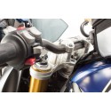 The factory spec S 1000 R is delivered with a sporty, forward leaning seating position. With this bar riser set, the handlebars are raised 25 mm and because of the angle of the triple clamp, the bars are brought slightly closer to the rider. The finish of these high quality risers closely matches the original bar clamps and makes this modification hardly noticeable to the eye. The kit comes complete with top grade hardware and the installation is simple.